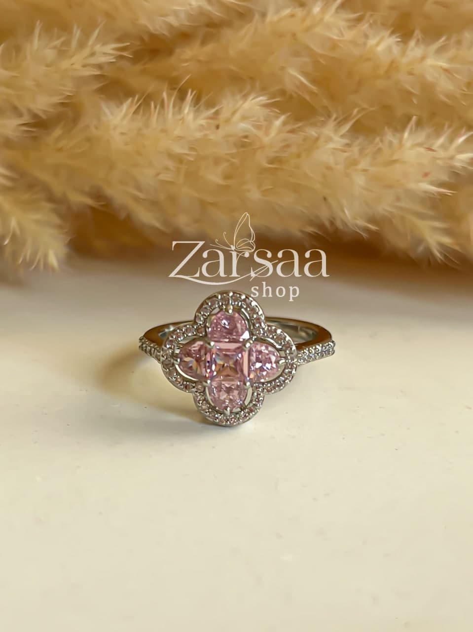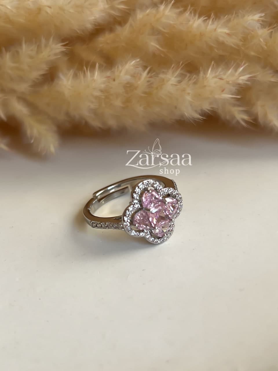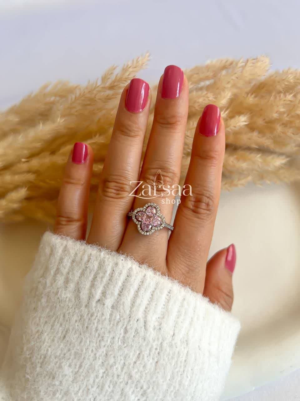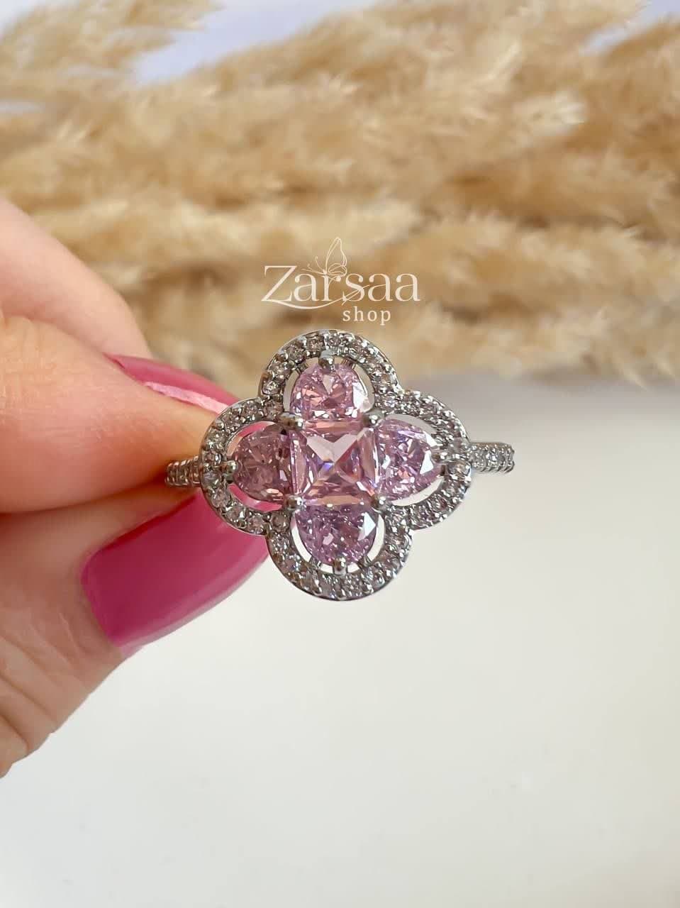 این انگشتر به رنگ نقره ای می باشد و با نگین های صورتی تزیین شده است .