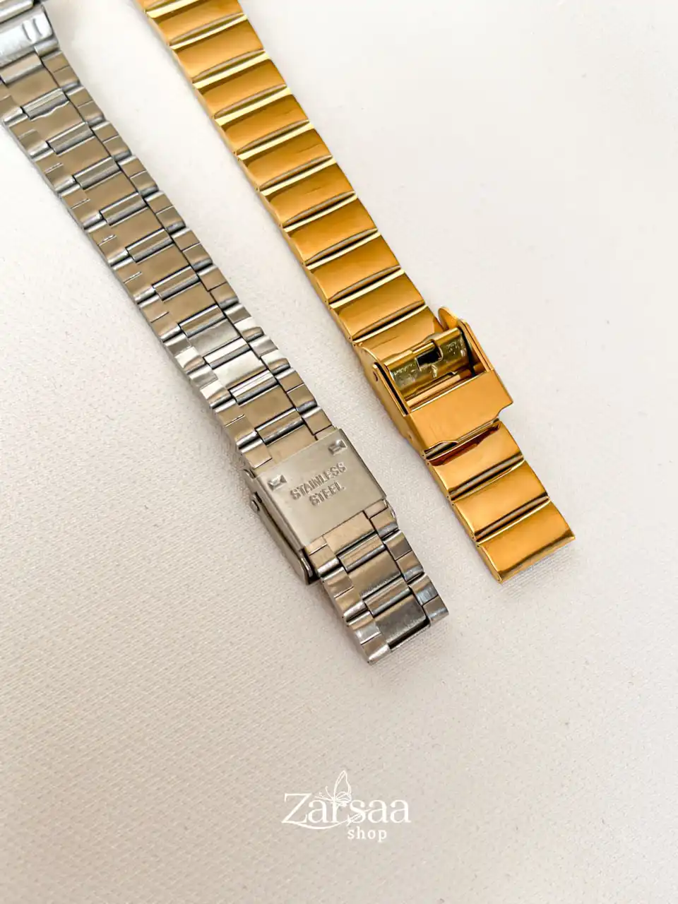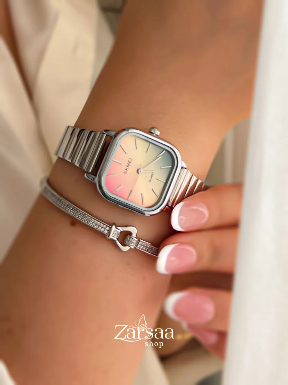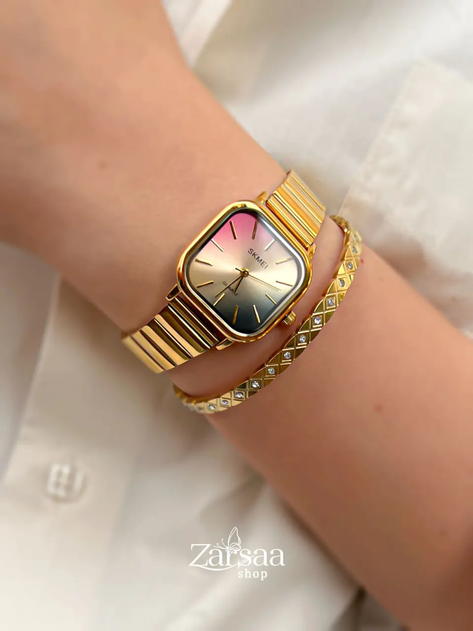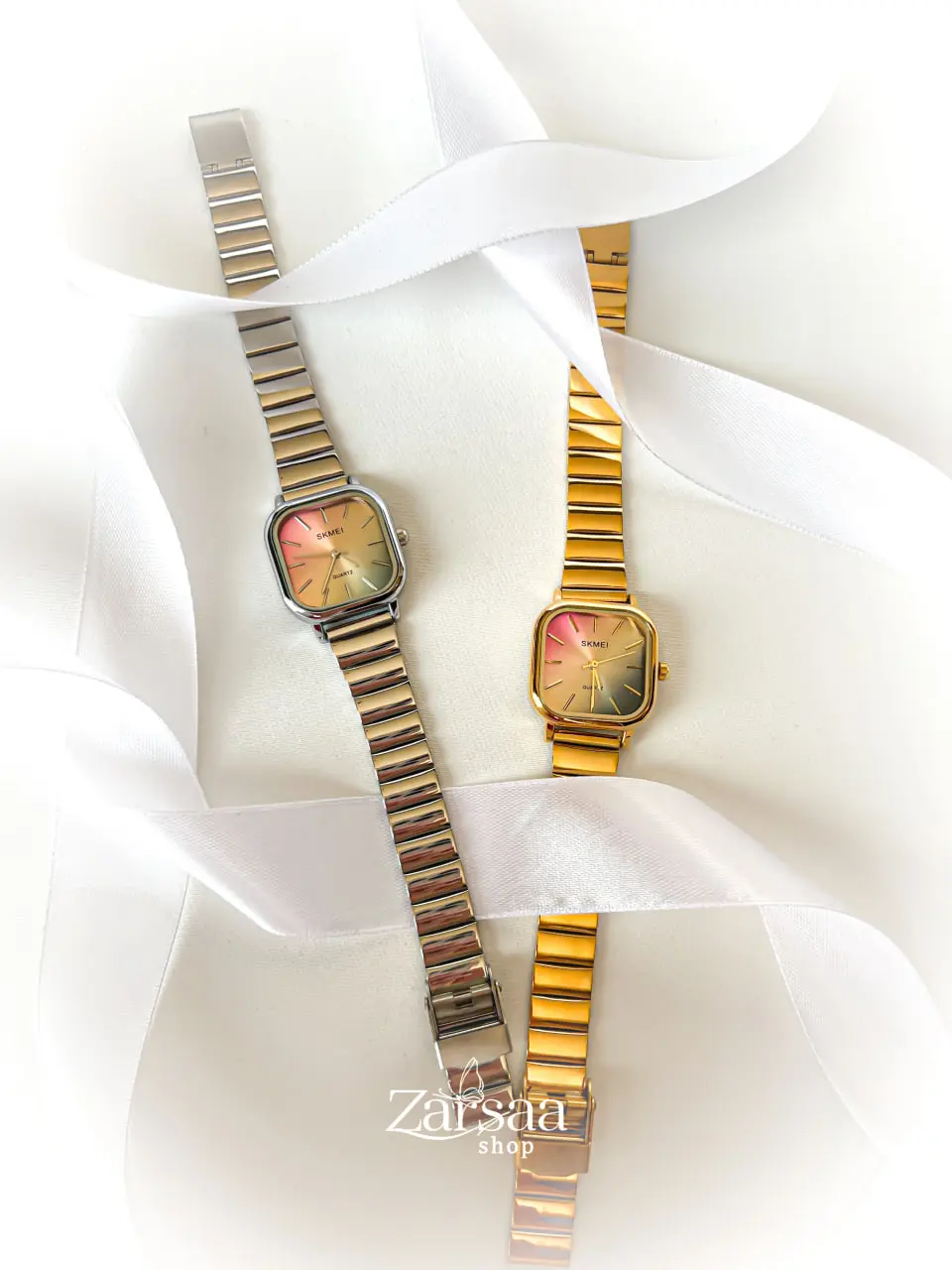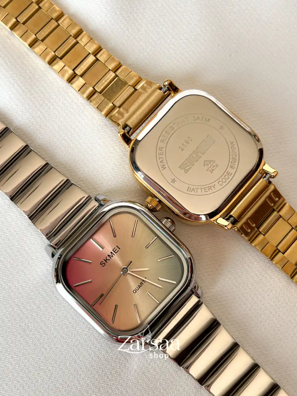 ساعت زنانه مربع بند کرکره ای SKMEI با ظاهر شیک و مینیمال در دو رنگ بندی سیلور و طلایی قابل سفارش است.