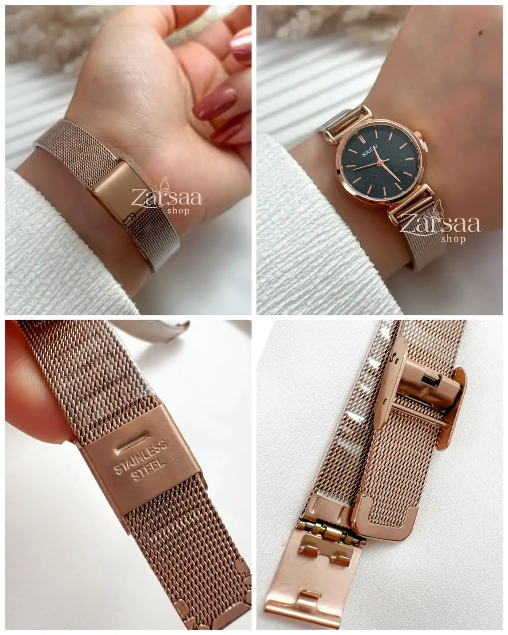 ساعت زنانه نایدو مدل ستاره با صفحه گرد ، مشکی و براق و بند حصیری از جنس استیل ضد زنگ و ضد حساسیت به رنگ رزگلد زیبایی منحصر به فردی را به استایل شما اضافه می کند.