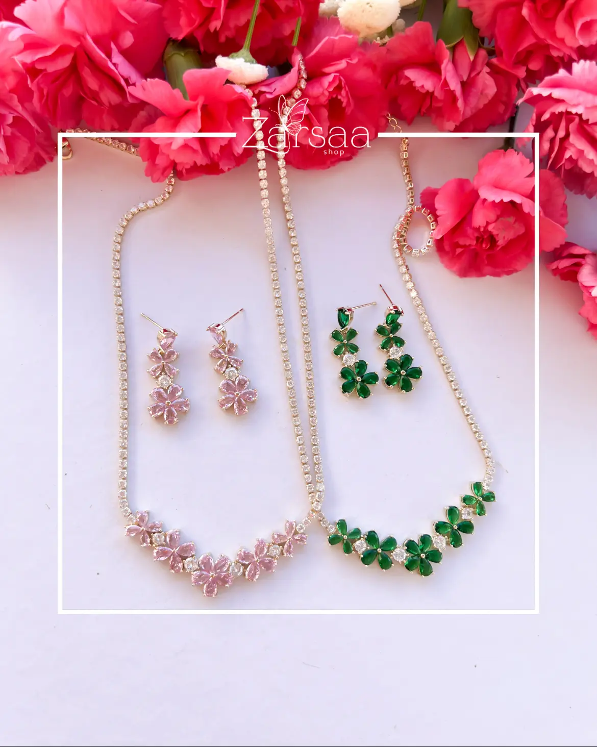 نیم ست شکوفه با طراحی زیبا ، منحصر به فرد و درخشش خیره کننده می تواند جذابیت الهام گرفته از طبیعت را به هر لباسی اضافه کند. جنس این نیم ست از استیل بوده و روکش آن آبکاری طلا می باشد . این نیم ست شامل گردنبند و یک جفت گوشواره است و با نگین های مخراج کاری شده در دو رنگ سبز و صورتی قابل سفارش می باشد.